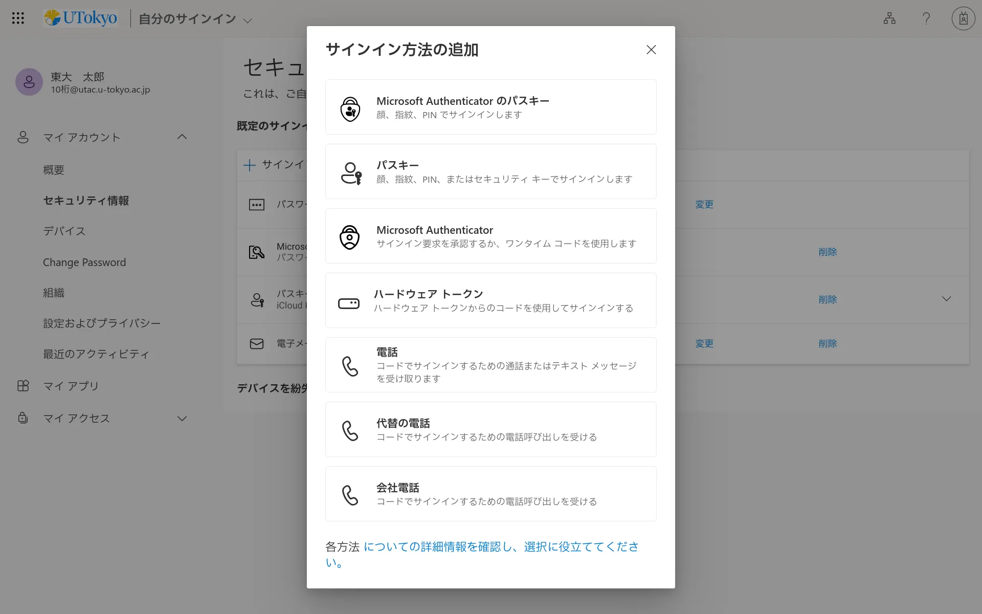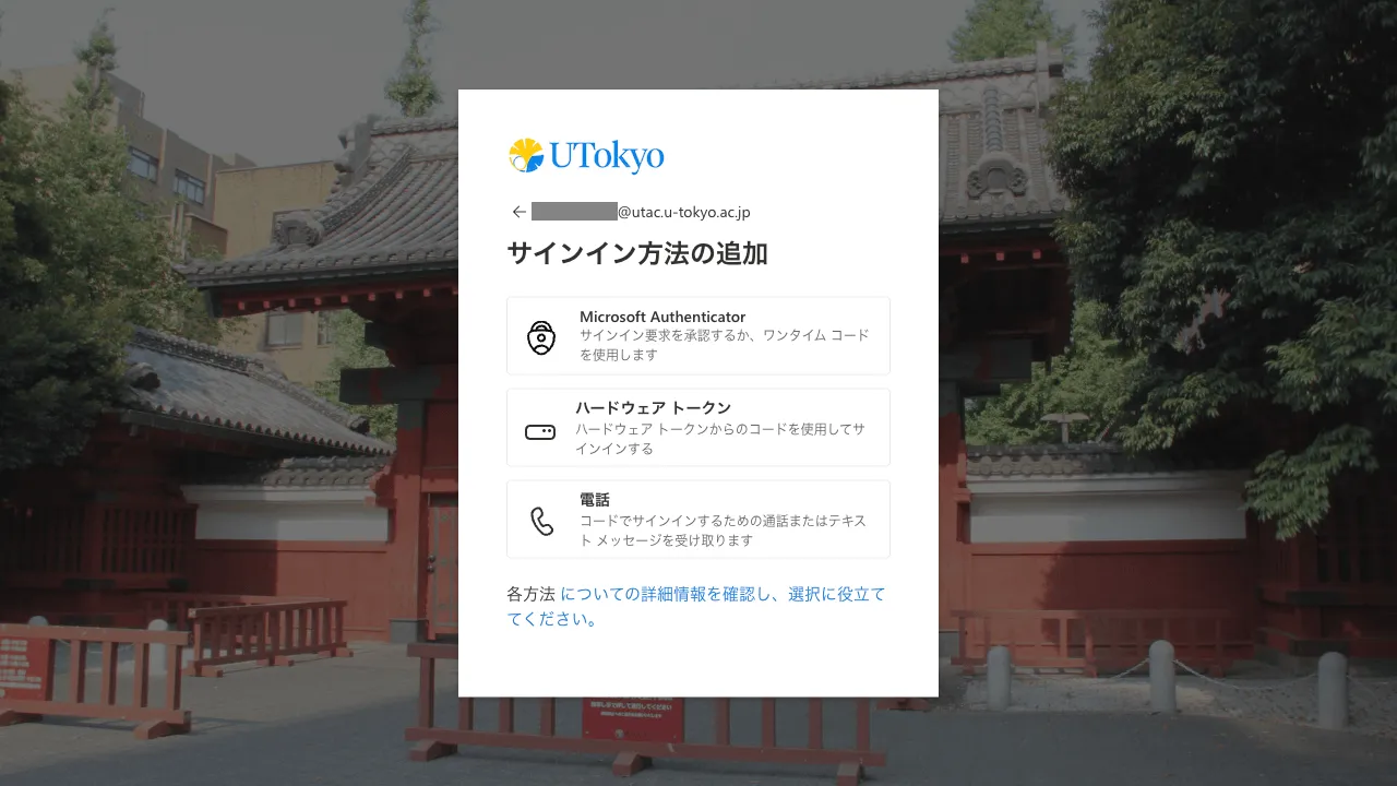 表示されているもの以外の本人確認方法を使いたい場合 サインイン時の本人確認方法は,登録されている方法のいずれか(通常,最初に登録したもの)がデフォルトとして自動的に選ばれます.他の本人確認方法を使いたい場合は,以下の手順で選択してください.