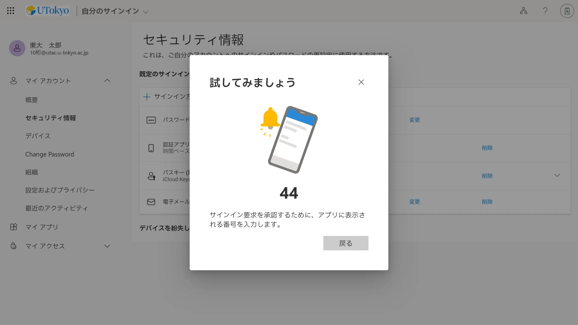 次に,ここまでに登録した本人確認方法を利用してUTokyo Accountにサインインすることができるか確認します.