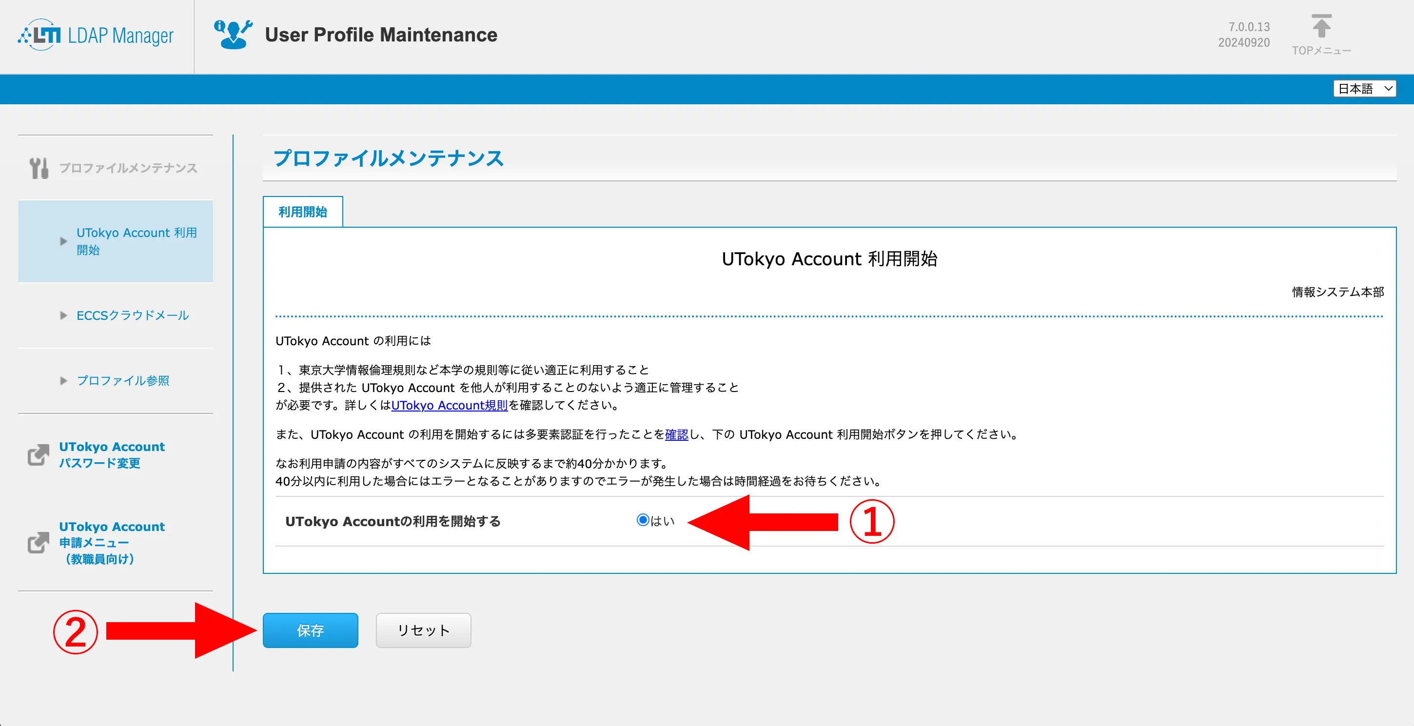 4. 表示されるUTokyo Accountに関する説明をよく読んでから,下の方にある「UTokyo Accountの利用を開始する」を「はい」にして,「保存」を押してください.