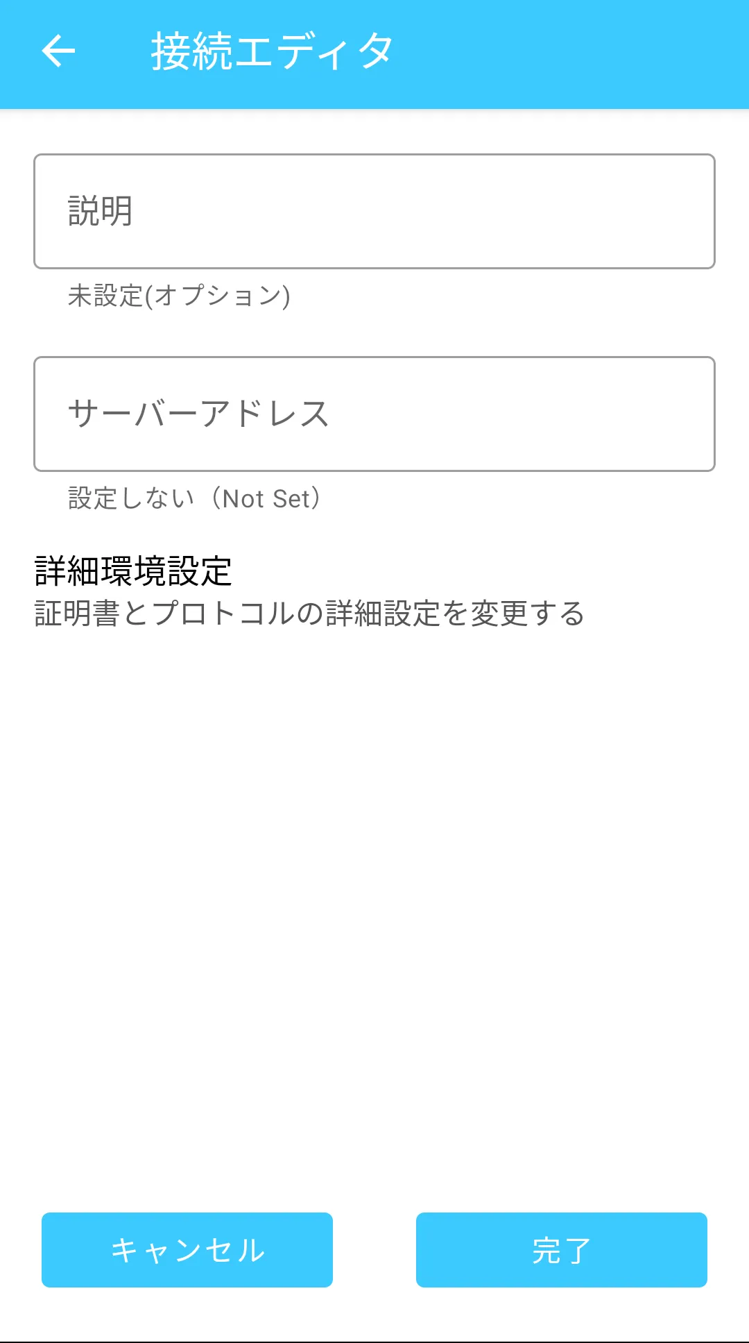 手順C: 上の画面で「Connections」(日本語で表示されている場合は「接続」)をタップし,続いて右下のプラス「+」ボタンをタップします.以下のような「接続エディタ」が表示されるので,「サーバーアドレス」をタップして vpn1.adm.u-tokyo.ac.jp と入力します.