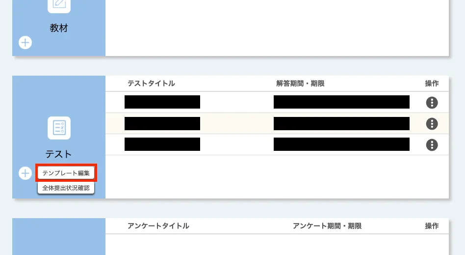 1. 「コーストップ」画面の「テスト」欄で「テンプレート編集」を押してください.「テンプレート一覧」画面が表示されます.