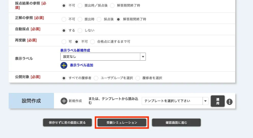 1. 「新規登録」もしくは「編集」画面の下部の「受験シミュレーション」を押してください.受験シミュレーションが始まります.
