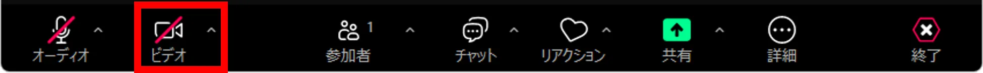 左下にある「ビデオ」と書かれたアイコンを押すことによってビデオのオン・オフを切り替えることができます.ビデオが停止されているときは,ビデオのアイコンに赤線のスラッシュが引かれます.